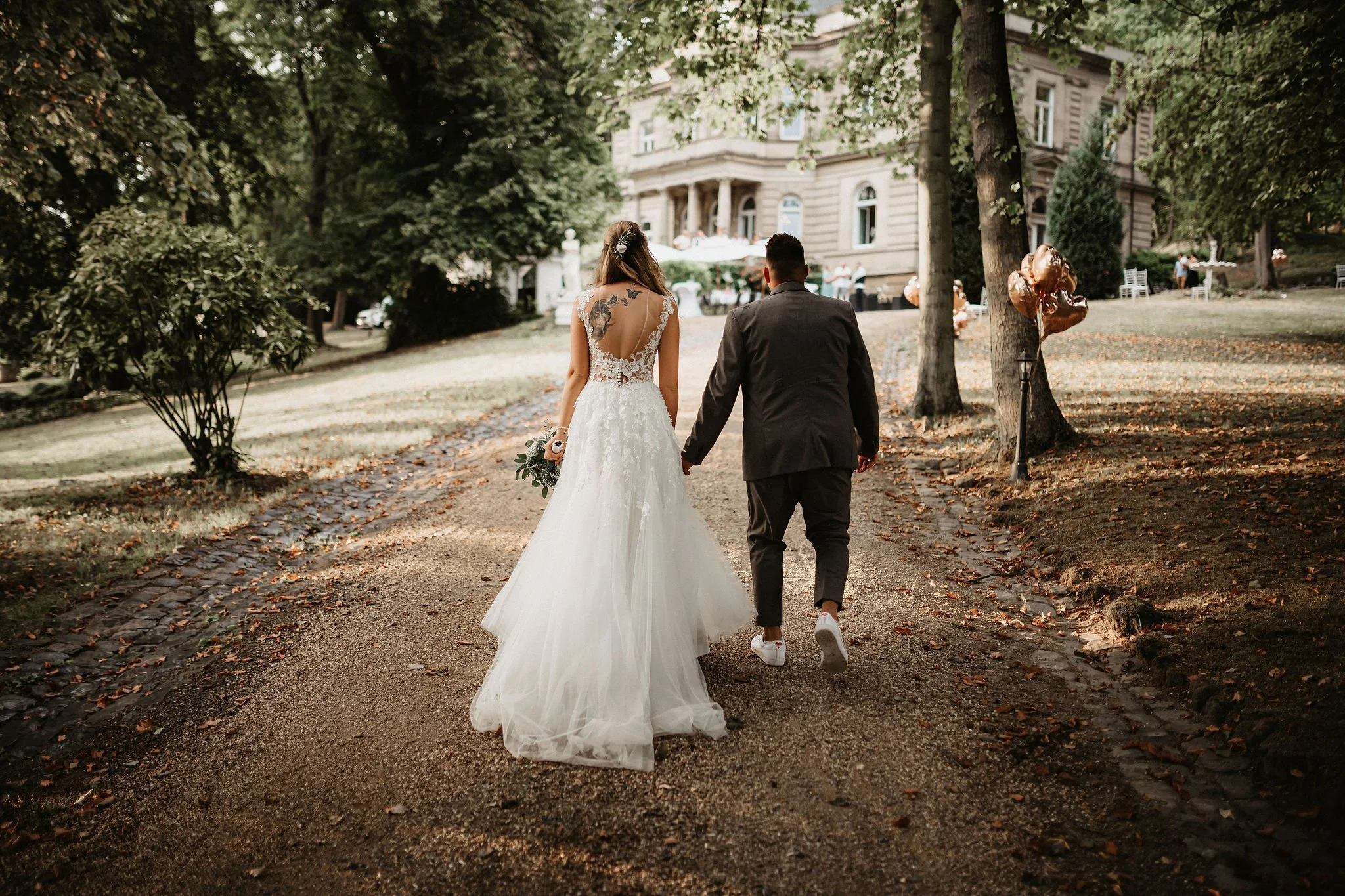 Die beiden machten sich klassisch, getrennt voneinander, zuhause oder bei ihren Freunden hübsch für ihren Tag, bevor es dann neben der Villa, bei bestem Wetter, zur Freien Trauung kam. Emotional, witzig & auch verrückt - so würde die Beschreibung zu diesem Tag wohl am besten alles aussagen. Tolle Gäste, schöne Reden, Überraschungen und Spiele machten den gesamten Tag wirklich einzigartig.